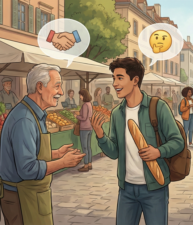 De sessie richt zich op communicatieve competentie buiten het klaslokaal en op het belang van het aanreiken van hulpmiddelen waarmee leerlingen zich kunnen redden in reële communicatieve situaties. Daarbij wordt benadrukt dat communicatie niet alleen draait om expliciete taal, maar ook om het impliciete taalgebruik: wat de spreker werkelijk wil overbrengen.